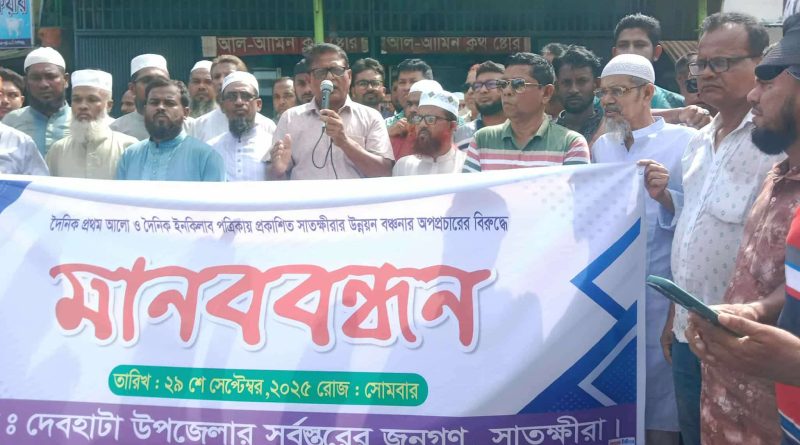 দেবহাটায় প্রথম আলো ও ইনকিলাব পত্রিকায় বিভ্রান্তিকর সংবাদের প্রতিবাদে মানববন্ধন
